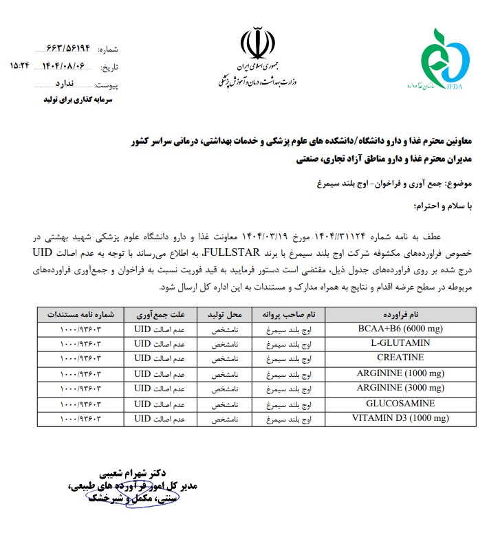 فراخوان فوری جمعآوری مکملهای بدنسازی و ویتامین غیرمجاز شرکت اوج بلند سیمرغ