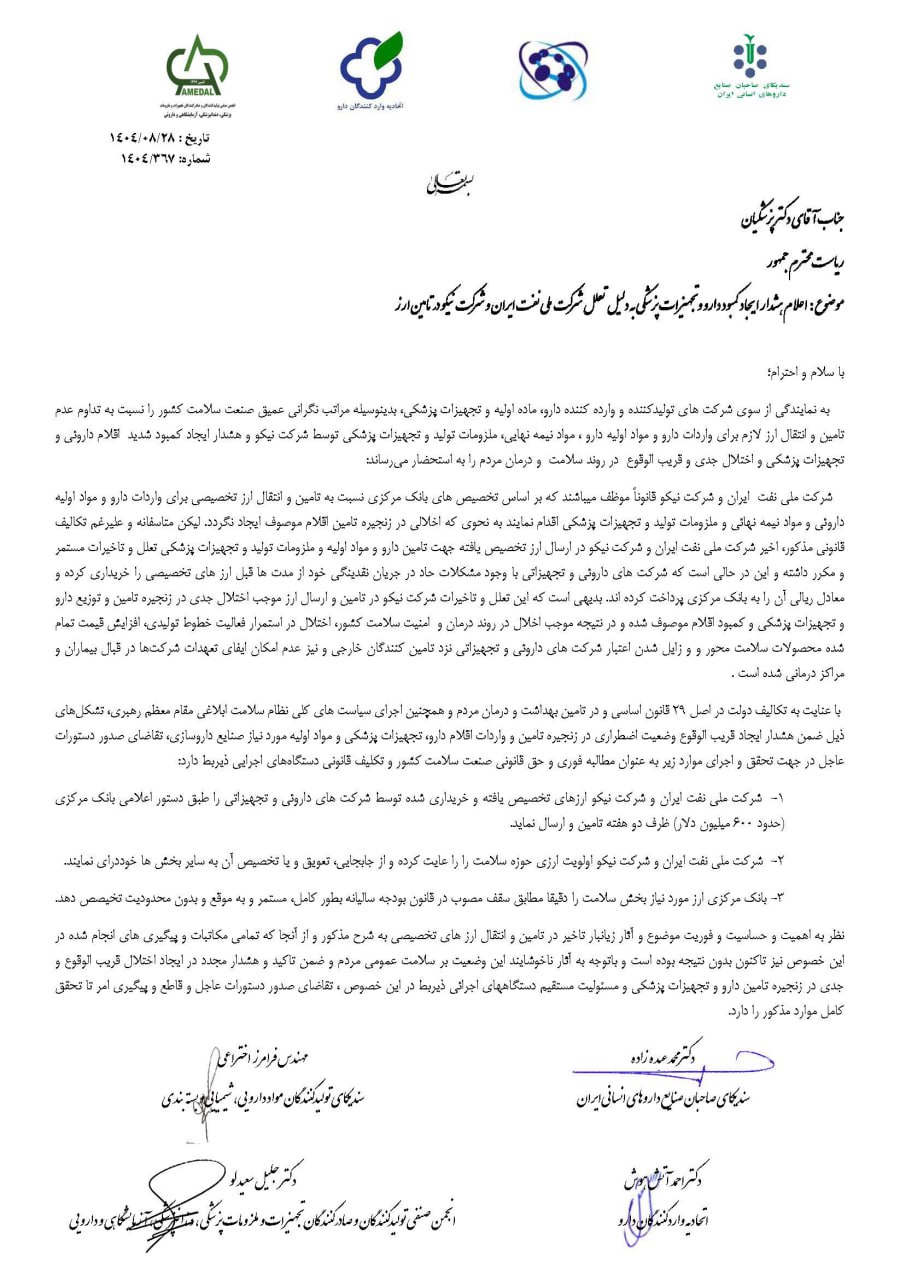 در این نامه که به امضای روسای هیئت‌مدیره سندیکای صاحبان صنایع داروهای انسانی ایران، سندیکای تولیدکنندگان مواد اولیه دارویی، اتحادیه واردکنندگان دارو و انجمن صنفی تولیدکنندگان و صادرات تجهیزات پزشکی رسیده، تأکید شده است که شرکت ملی نفت ایران و شرکت نیکو علیرغم تکالیف قانونی، در تأمین و ارسال ارزهای تخصیصی حوزه سلامت دچار تعلل و تأخیرهای مکرر بوده‌اند؛ موضوعی که اکنون زنجیره تأمین دارو و تجهیزات پزشکی کشور را در معرض اختلال جدی قرار داده است.