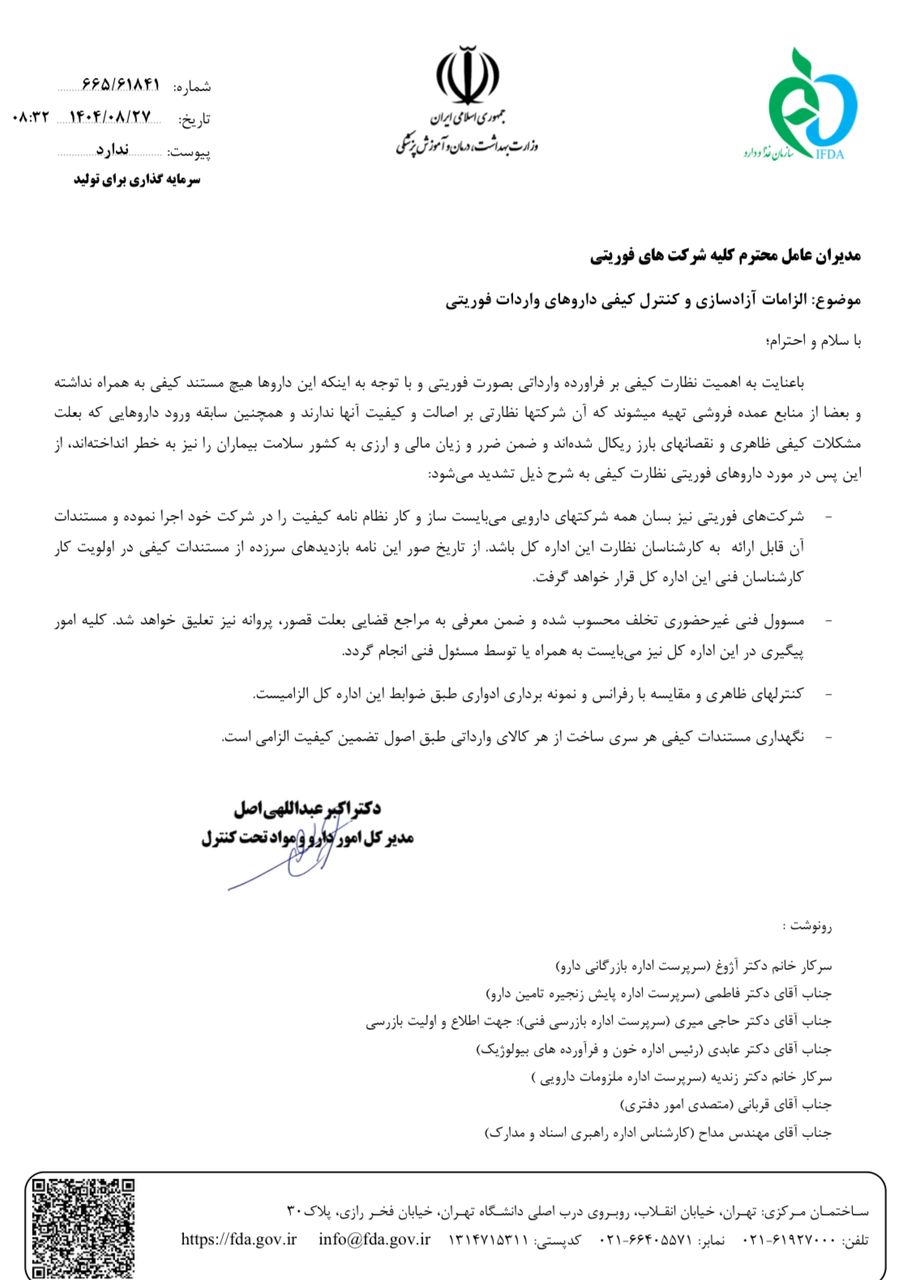 سالمخبر: اکبر عبداللهیاصل، مدیرکل امور دارو و مواد تحت کنترل سازمان غذا و دارو، در نامهای رسمی خطاب به مدیران عامل شرکتهای فوریتی، از تشدید نظارتهای فنی و کیفی بر داروهای وارداتی فوریتی خبر داد.