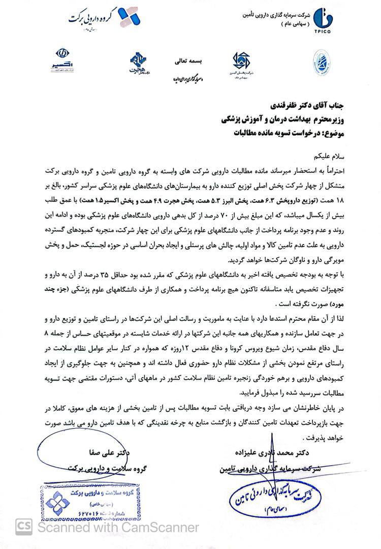 در بخشی از این نامه که خطاب به وزیر بهداشت ارسال شده، آمده است: «مانده مطالبات دارویی شرکتهای وابسته به گروه دارویی تامین و گروه دارویی برکت … بالغ بر ۱۸ همت با عمق طلب بیش از یکسال است که این مبلغ بیش از ۷۰ درصد کل بدهی دارویی دانشگاههای علوم پزشکی بوده و ادامه روند کنونی منجر به کمبودهای گسترده دارویی، عدم تأمین کالا و مواد اولیه، چالشهای پرسنلی و ایجاد بحران اساسی در حوزه لجستیک، حمل و پخش مویرگی خواهد شد.»